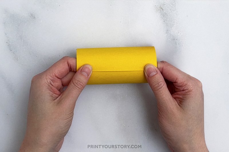 - Wrap the roll. Cut a rectangle of yellow paper and wrap it around the toilet paper roll. Glue or tape it in place.
