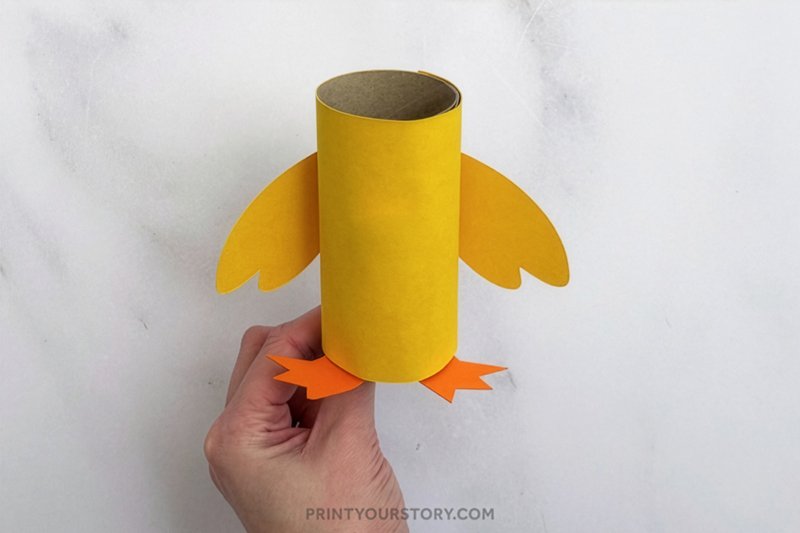 Grab the printable template and use it to trace two wings and two feet onto colored paper (yellow for the wings and orange for the feet looks great). The wings are soft, rounded shapes, and the feet have a cute three-toe design that’s easy to cut out. Once you’ve cut everything, glue the wings to each side of the roll.