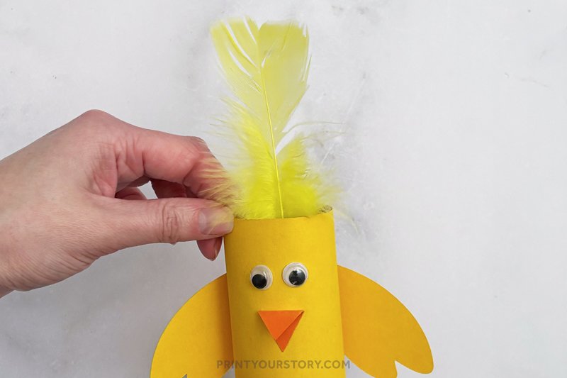 - Add a feather. Glue a yellow feather inside the top of the roll to give your chick a fluffy little tuft.