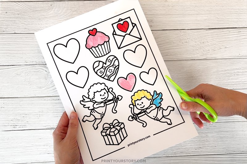 Great for practicing scissor skills. The printable includes lots of shapes to work with, from simple hearts to detailed little Cupids and treats.